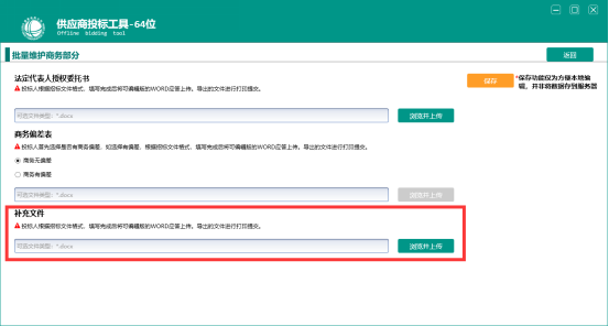 (2)商务文件:按分标制作为docx格式,按包批量在投标工具-商务部分-维护商务部分-补充文件端口上传。同一分标的每包文件内容应一致。