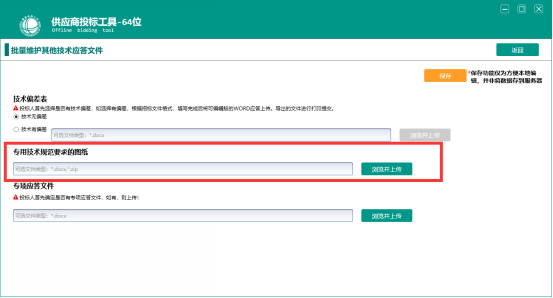 (3)技术文件:按分标制作为docx格式,按包批量在按包批量在投标工具-其他技术投标文件-维护其他技术投标文件-专用技术规范要求的图纸端口上传。